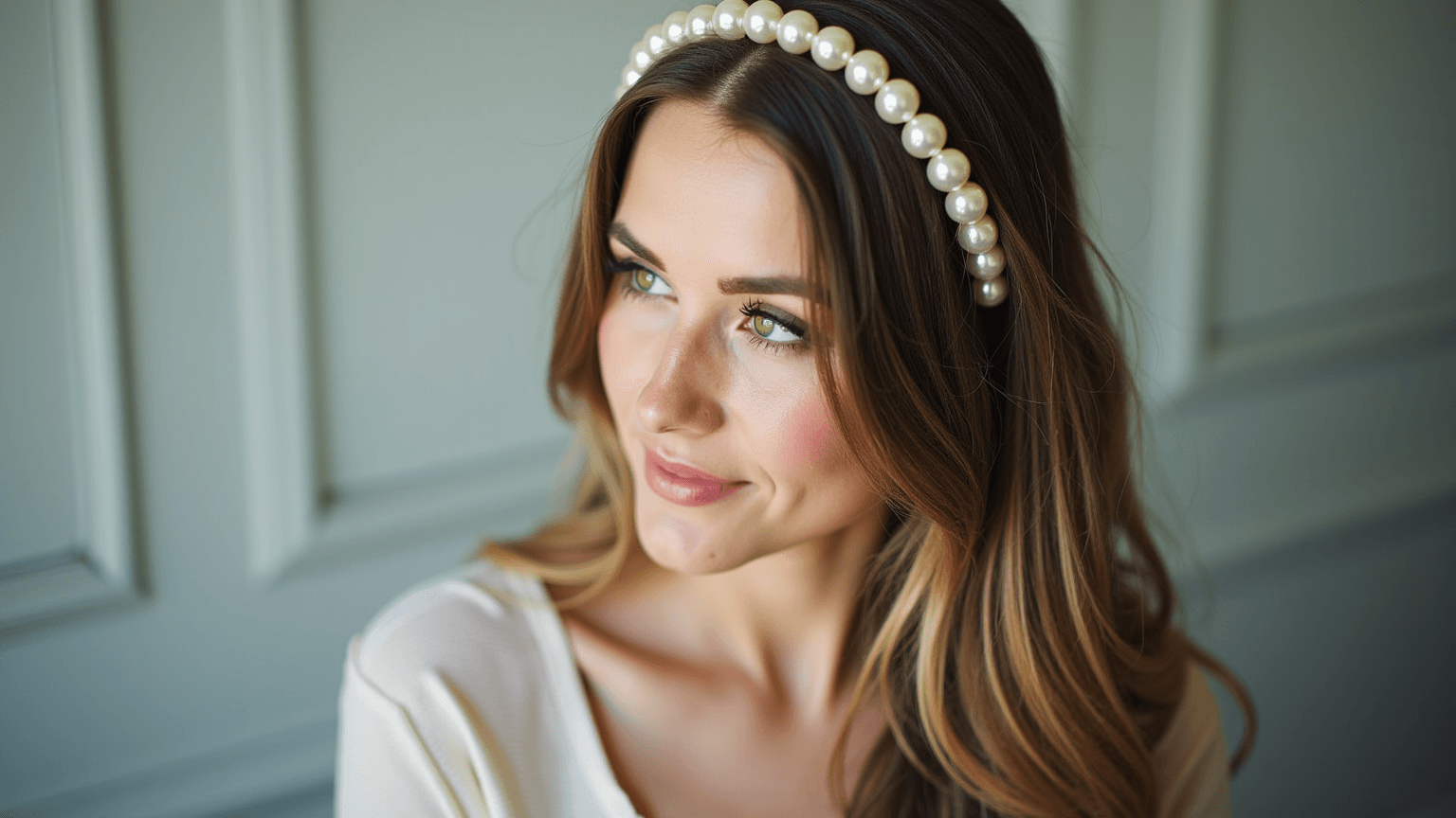 This structured white headband with pearl details is EVERYTHING 2025 beauty goals are made of! The way it’s elevating that wavy brown hair into total “old money” aesthetic territory has me SHOOK! And those gold hoops? Pure. Style. GENIUS!